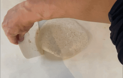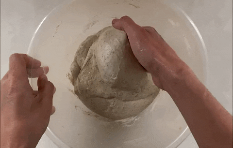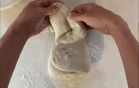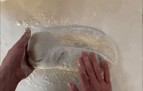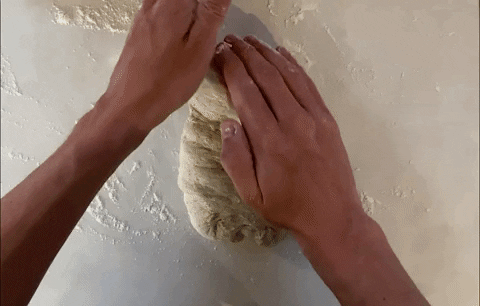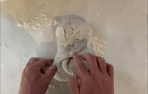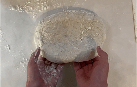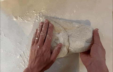 To create the final shape you need to perform a series of folds. Start by pulling the bottom out and fold over the dough. Then pull each side separately and fold over the dough. Pull the top and fold over itself. You want to build nice even tension across the sides of the dough, you can do this by folding the edges in over themselves making the loaf nice and tight. Fold over itself. Leave for 1 minute to let the seam on the bottom seal.